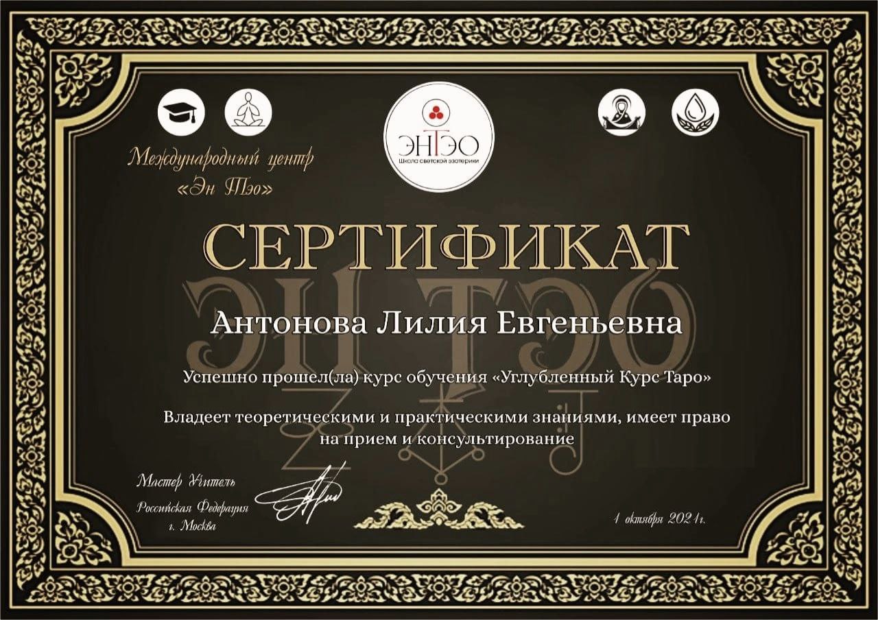 Также я являюсь и сертифицированным мастером Таро. Делаю расклады на все сферы жизни.